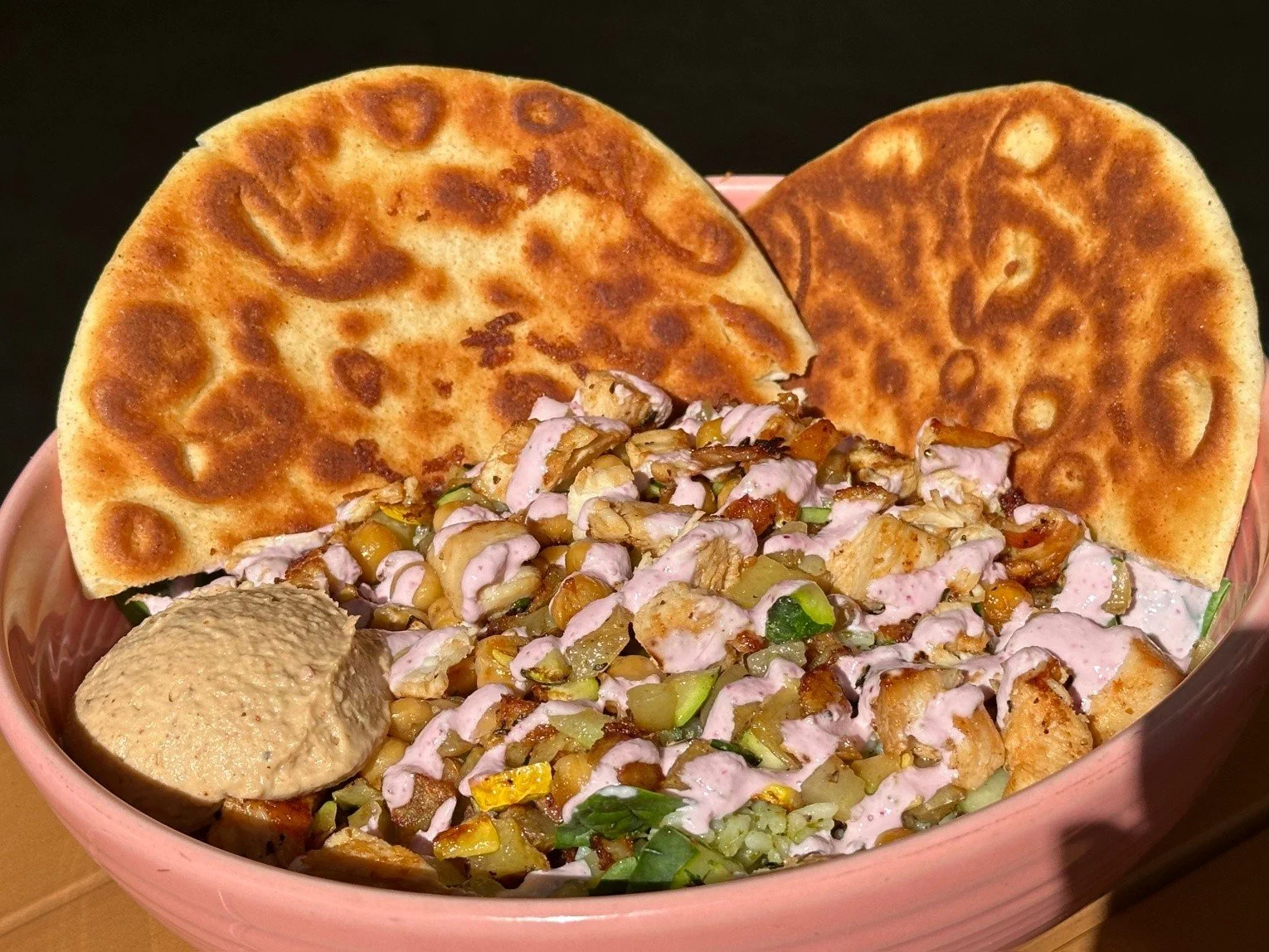This week's special starts on a bed of cilantro-lime rice, fresh spinach, and a cucumber salad. We add your choice of protein with grilled chickpeas, zaatar-seasoned potatoes, and grilled zucchini-squash blend. We finish this off with tangy yogurt sauce, creamy black-eyed pea hummus, and crispy pita bread!