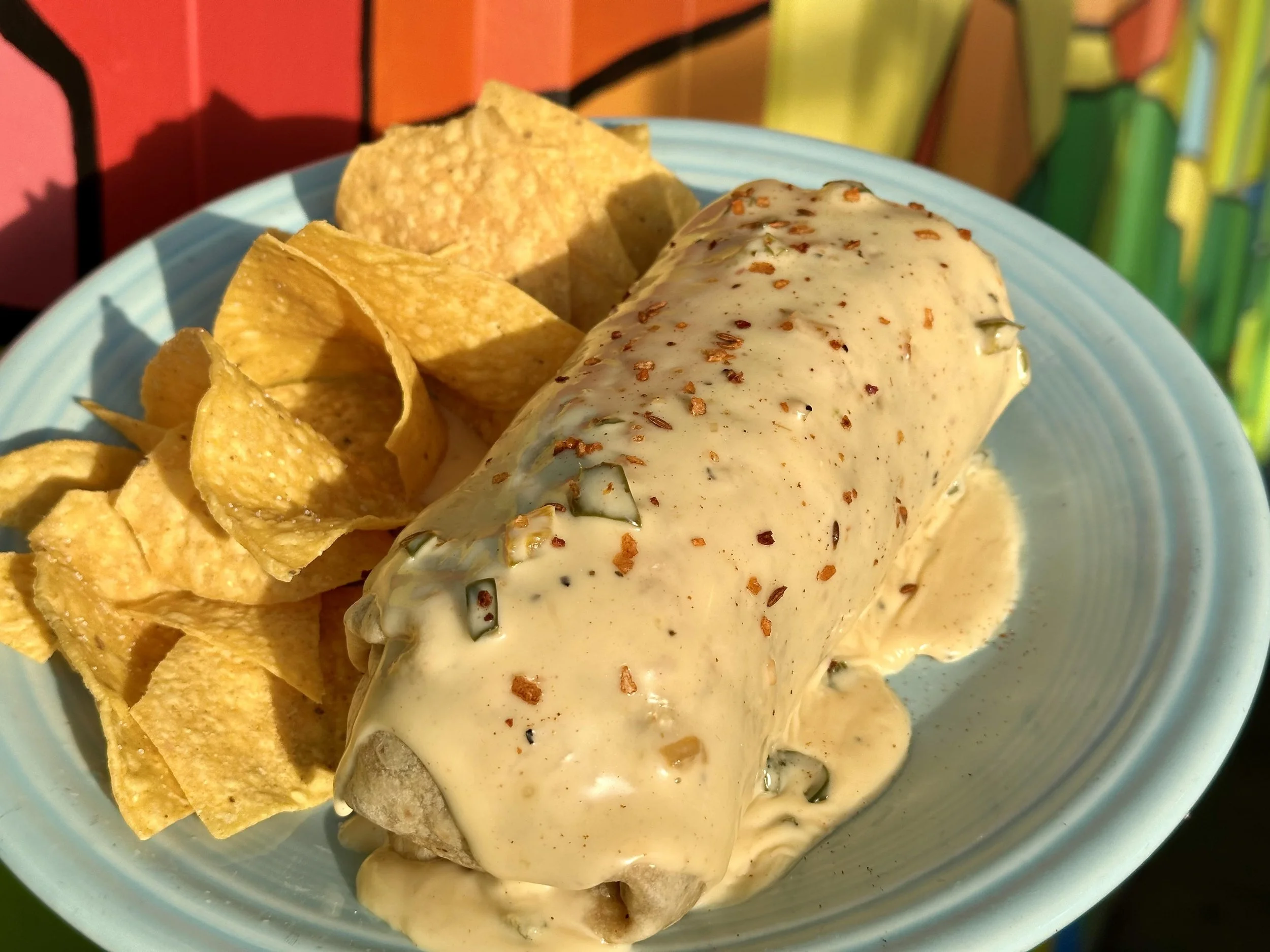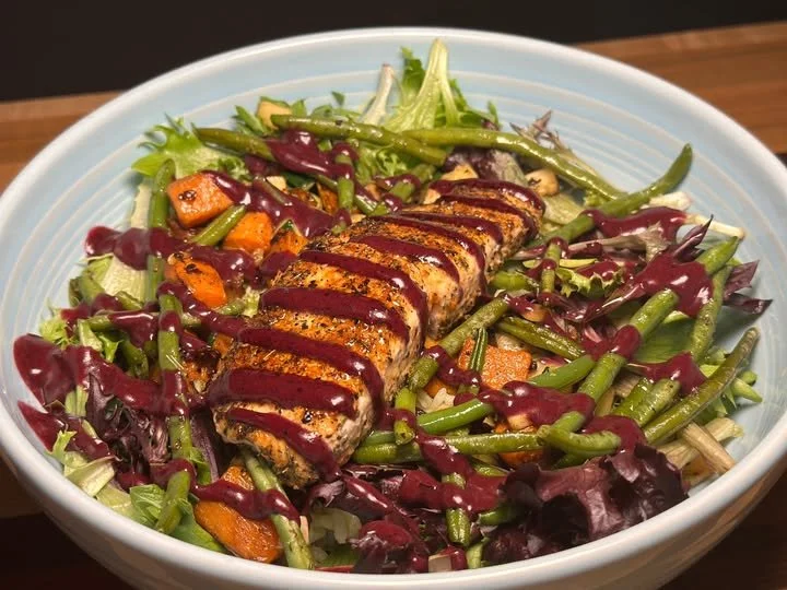 This week’s special begins with a hearty scoop of cilantro-lime rice and Arcadian greens. We add grilled salmon, herb de Provence green beans, roasted sweet potatoes, and grilled zucchini-squash blend. This one is finished off with our house blueberry vincotto sauce and served with tortilla chips!