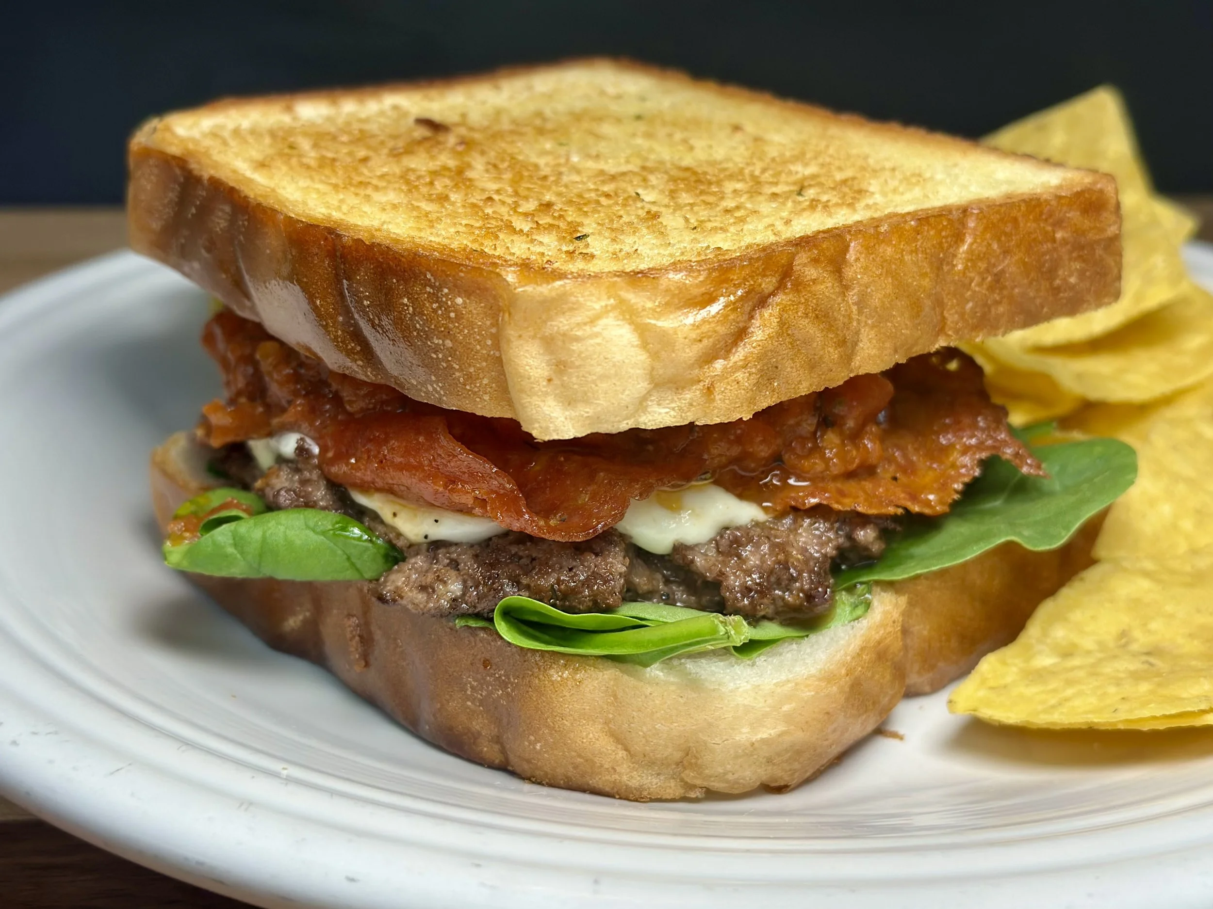This week's burger is sure to warm you up from the cold! We start this one on a garlic-butter Texas toast with baby spinach. We add a black Angus beef patty, grilled pepperoni, melted mozzarella, and grilled banana peppers. We add house-made marinara sauce and serve it with house-fried tortilla chips!